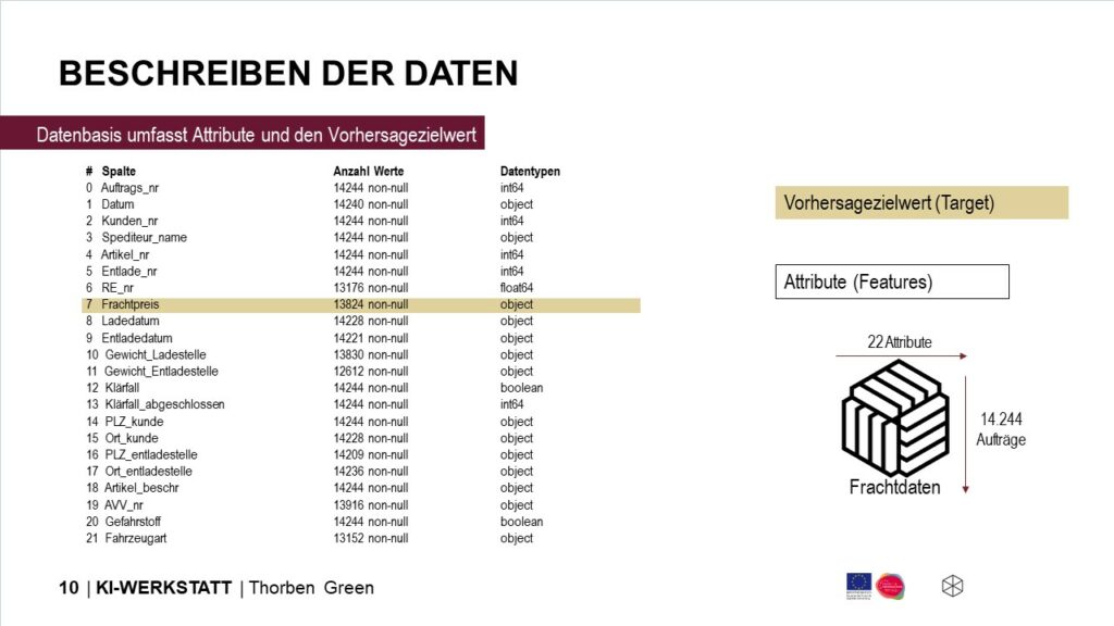 Der Datensatz in unserem Beispielprojekt umfasst insgesamt 22 Attribute. Dabei ist der Frachtpreis das Zielattribut. Alle anderen sind beschreibende Attribute und stehen jeweils mehr oder weniger in einem Verhältnis zum Frachtpreis. Wie sehr dieses Verhältnis ausgeprägt ist, gilt es in den nächsten Schritten herauszufinden. Stark ausgeprägte Beziehungen helfen später dem Algorithmus bei der Prognose.