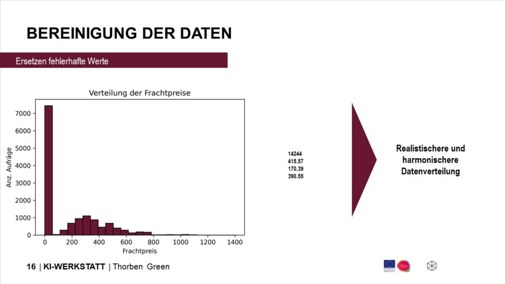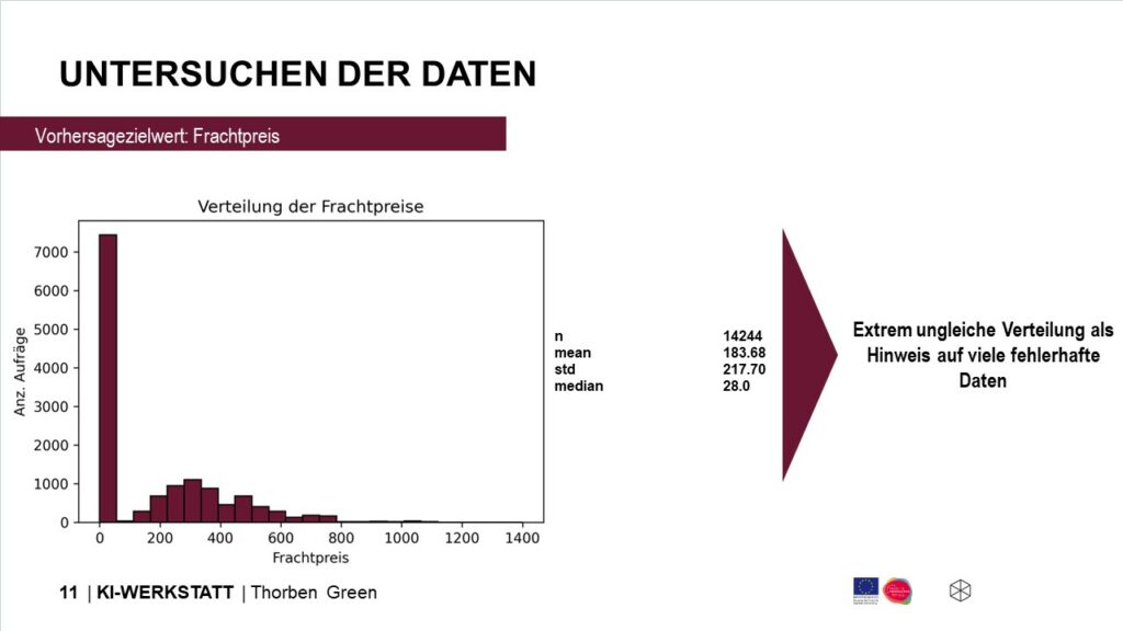 In den folgenden wird gezeigt, wie wir zusätzliche Informationen in den Spalten genutzt haben. Zu Beginn jedoch noch einmal zurück zu dem ungleich verteilten Zielattribut. Zunächst wurden in €/to angegebene Preise mit dem Ladegewicht multipliziert (Ladegewicht hier also noch hilfreich!) Dazu bekamen wir vom Unternehmen die Freigabe simple Annahmen zu treffen: