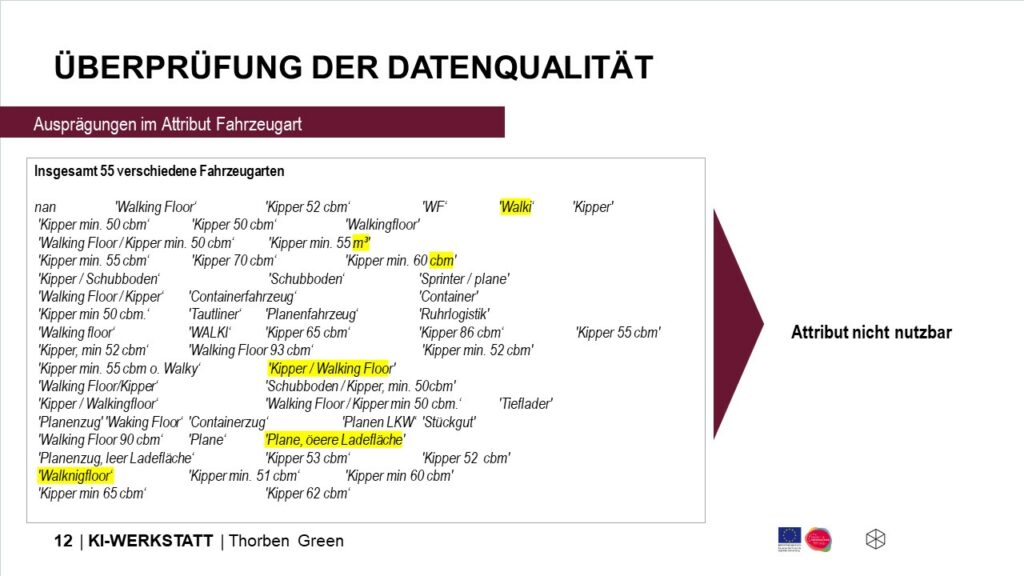 In vielen Unternehmen sind Freitextfelder noch usus. Für Datenauswertungen und datenbasierte Entscheidungen wie bei ML ist dies mindestens eine Herausforderung. Es konnten viele unterschiedliche Einträge mit gleicher Aussage identifiziert werden.