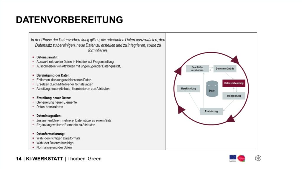 Maßnahmen aus der vorangegangenen Exploration der Daten sind im Rahmen der Datenvorbereitung umzusetzen. Der bisherige Datensatz wird im Rahmen der Datenauswahl auf die relevanten Daten eingegrenzt. Ein wichtiger Schritt dabei ist die Datenbereinigung. Irrelevante oder Attribute mit zu geringer Datenqualität sind zu entfernen. Genauso kann aber auch die Erstellung neuer Daten oder die Ableitung anderer Attribute hilfreich sein. Zudem können weitere externe Attribute genutzt werden um den Datensatz mit Informationen anzureichern.