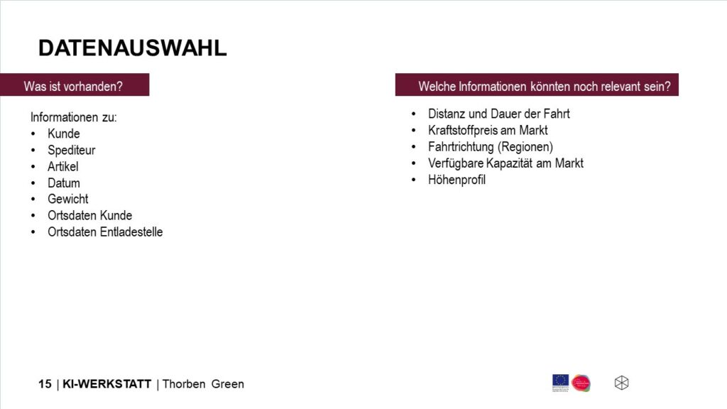 Im Folgenden soll anhand des Beispiel des Transportunternehmens ein Projekt der KI-Werkstatt vorgestellt werden. Der Fokus liegt dabei auf dem Prozess der Datenauswahl. Die Datenauswahl begleitet Beteiligte in ML-Projekten vom ersten Treffen bis hin zur Modellbildung.