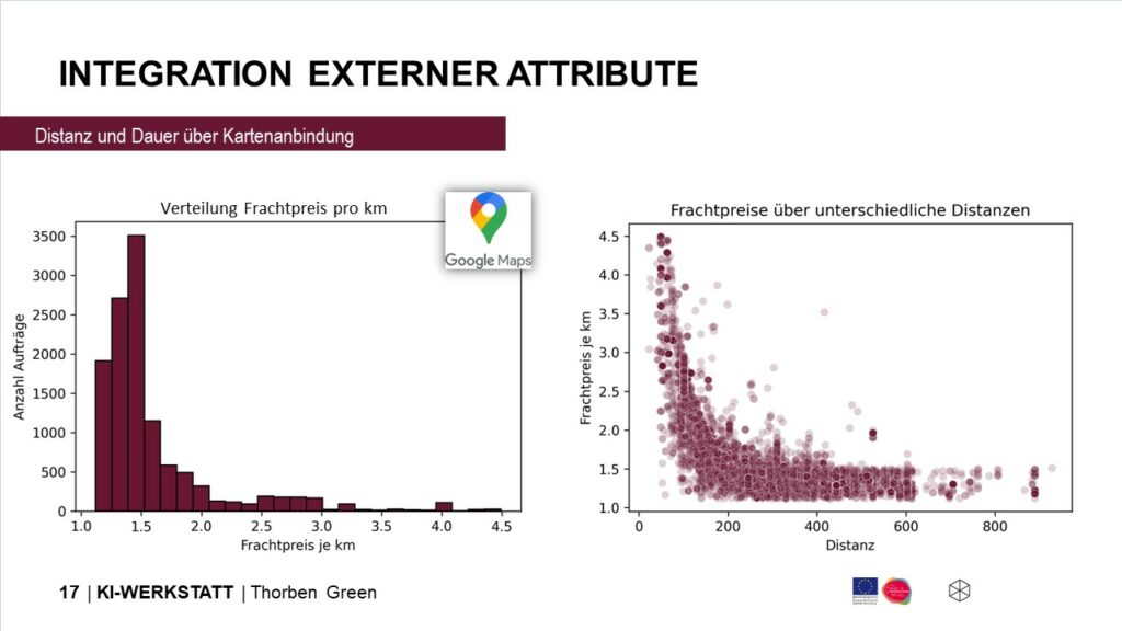 Um den Frachtpreis pro km zu berechnen, fehlt das Attribut Distanz in der Datenbank vom Projektpartner. Jede Fracht einzeln bei Maps eingeben, ist keine Option, weder für die bestehenden Daten, noch für eine zukünftige Anwendung. Es kann allerdings eine bestehende Google Schnittstelle genutzt werden. Mit ein wenig Programmcode können nun über die verfügbaren PLZ und Orte die Distanzen und Fahrtdauern aller Aufträge ermittelt und in den Datensatz eingespeist werden. Ein erstes Beispiel dafür, wie auch unternehmensexterne Daten für KI-Anwendungen genutzt werden können. Es ist somit ein klarer Zusammenhang zwischen der Verteilung der Frachtpreise/km und den Aufträgen aufgeteilt nach Distanz und ihrem Frachtpreis zu erkennen.