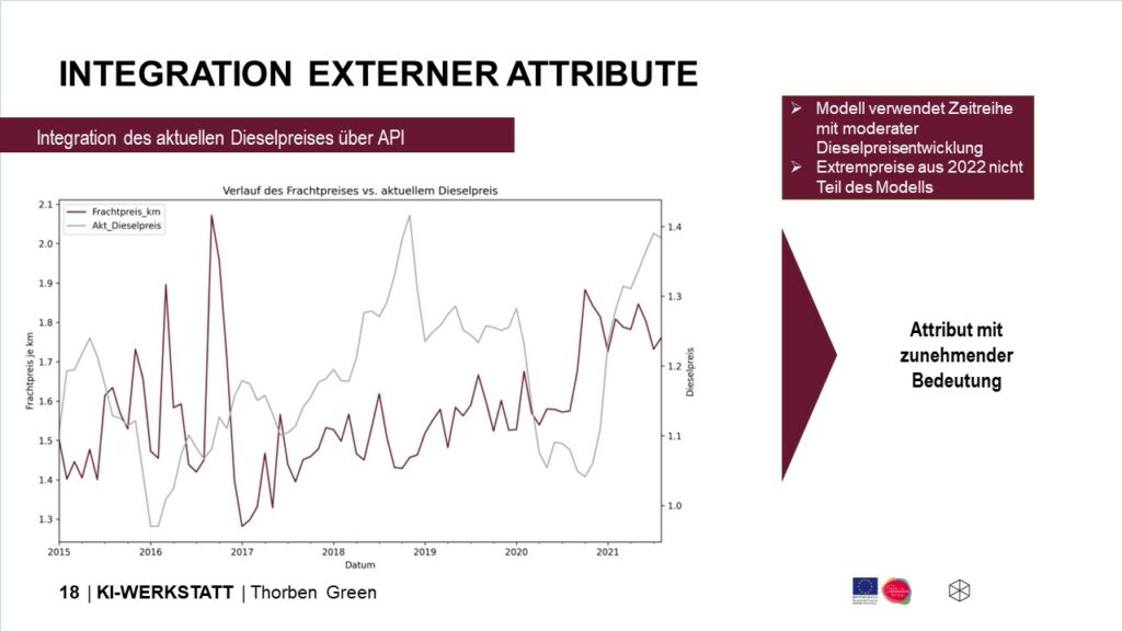 Als weiteres neues Attribut bietet sich im Transportwesen der Dieselpreis an. Ein Vergleich des durchschnittlichen Frachtpreises/km und dem Dieselpreis unterstreicht die Beziehung. Insbesondere ab 2017 schwanken die Werte in der Tendenz miteinander. Eine Integration erscheint damit sinnvoll und kann auch über eine automatische Schnittstelle umgesetzt werden.