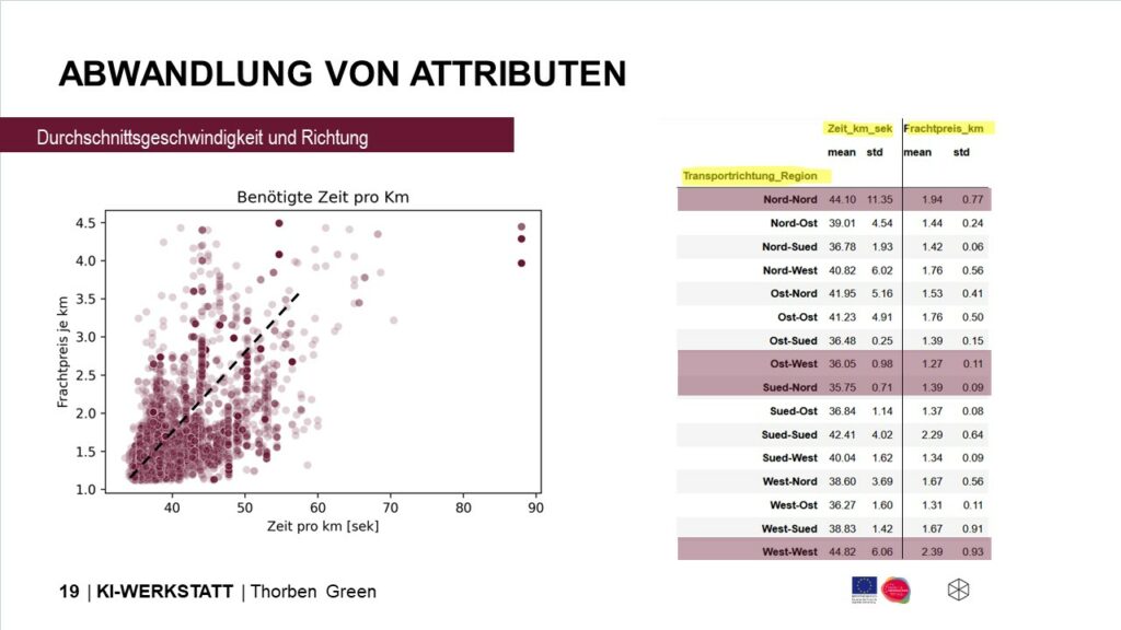 Weiterhin ist interessant, von wo nach wo der Transport stattfindet und ob dieser Weg über Autobahnen oder Landstraßen, oder durch Stadtgebiet oder Nadelöre mit Staupotenzial führt. Aus den Google-Daten lässt sich neben der Distanz auch die Dauer ableiten, woraus die Zeit/km berechnet werden kann, also ein Indikator für die Durchschnittsgeschwindigkeit. Die Grafik links zeigt den Frachtpreis je km in Abhängigkeit von der Zeit je km. In der Tendenz steigt der Frachtpreis, je länger man für einen km braucht. Die Transportrichtung scheint hier ein entscheidender Faktor zu sein. Beispielsweise ist die Zeit/km auf der Kurzstrecke im Norden und Westen am höchsten. Während die längeren Strecken Süd-Nord und Ost-West die geringsten Werte aufweisen. Dies schlägt sich auch in den FP/km nieder.