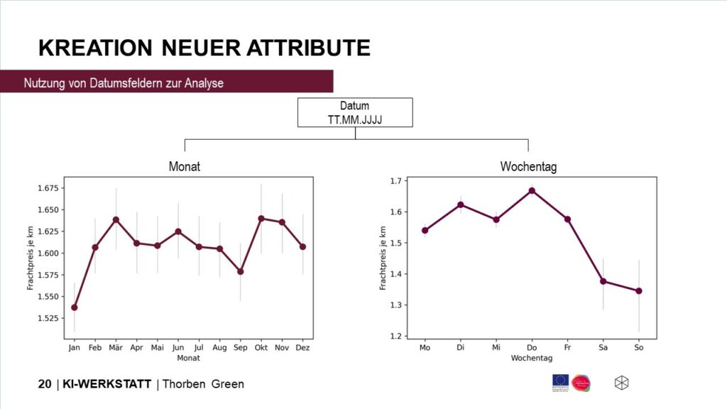 Auch aus bestehenden Attributen lassen sich neue Erkenntnisse generieren. Aus einem einfachen Datumsfeld etwa, können Schwankungen unter der Woche oder im Jahresverlauf ermittelt werden. Eine interessante Frage ist, ob die Frachtpreise über das Jahr oder unter der Woche schwanken: