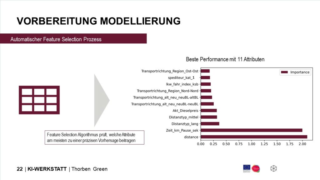 Dies ist insbesondere von Bedeutung, da kategorische Attribute im Rahmen der Modellierung noch umgewandelt werden müssen in lesbare Daten für Maschinen. Bspw. entstehen beim sogenannten Encoding aus einer Spalte mit 5 Farben (orange, rot, grün, blau, weiß) die Modellierung 5 Spalten in denen eine 1 steht, falls zutreffend. Aus diesem Grund ist es ratsam nach dem manuellen Prozess noch einen automatischen Prozess den sogenannten Feature Selection anzuschließen. Im Beispielprojekt hat sich gezeigt, dass das Modell bei Auswahl von 11 Attributen am besten prognostiziert. Die Attribute werden geprüft, inwiefern sie zu einer präziseren Vorhersage beitragen oder nicht. Gemessen in Feature Importance. Rechts ist dargestellt welche Attribute dem Modell am meisten helfen.