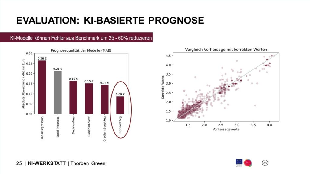 Durch Anwendung von Algorithmen, die auch mehrdimensionale, nicht lineare Zusammenhänge identifizieren können, kann der Fehler jedoch bis auf 9 Cent Abweichung reduziert werden. Das sind ca. 60% Einsparungen für die Firma.