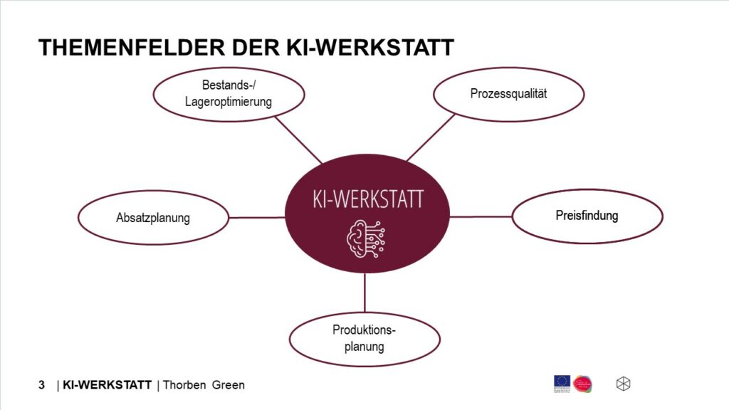 Die KI-Werkstatt an mit verschiedenen Unternehmen aus verschiedenen Branchen zusammengearbeitet. Aus diesen Kooperationen haben sich fünf Themenfelder herauskristallisiert.
