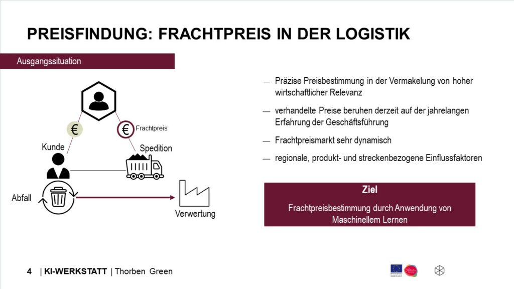 Eine Kooperationspartner war ein Transportunternehmen für Abfallprodukte. Das Unternehmen verwertet die Abfälle nicht selbst, sondern transportiert diese durch ganz Deutschland. Die Kunden des Unternehmens zahlen für die Entsorgung und das Unternehmen verbringt den Abfall zu entsprechenden Verwertern. Um kein Verlustgeschäft zu machen, ist es also wichtig zu wissen, welcher Frachtpreis für die benötigte Lösung des Kunden auf dem Speditionsmarkt zu erwarten ist.