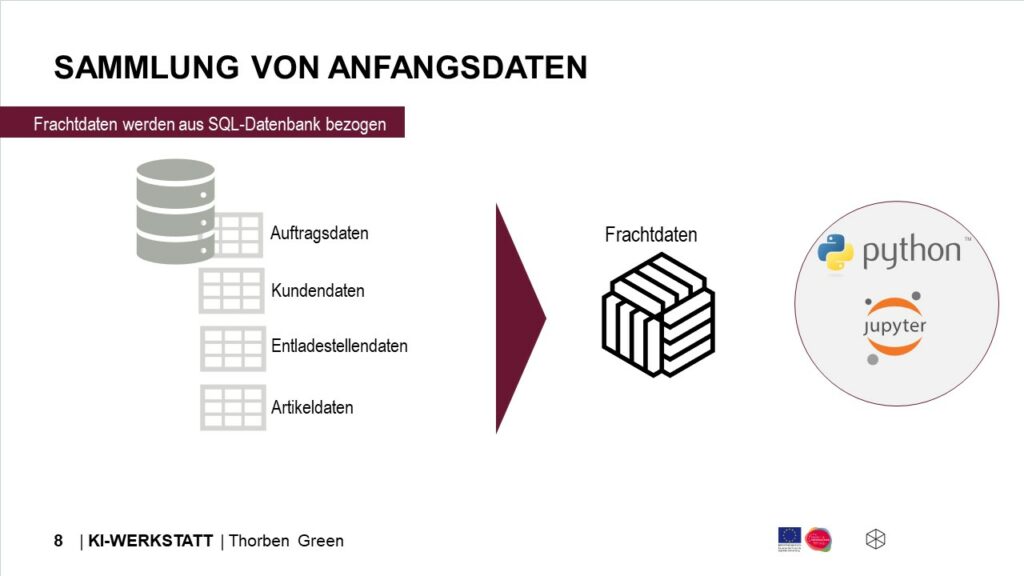 Wie schon im CRISP-DM angedeutet, basiert jede KI-Anwendung auf Daten, im Zusammenhang mit der Fragestellung. In unserem Beispielprojekt wird das Geschäft über Access abgebildet und in einer SQL Datenbank gespeichert. Für die Fragestellung wurden daraus vier wesentliche Tabellen extrahiert Für das KI-Modell werden diese Daten miteinander verknüpft, sodass großer Datenwürfel mit den zu untersuchenden Frachtdaten entsteht. Die Zusammenführung und Analyse der Daten erfolgt in der Programmiersprache Python. Im Data Science Bereich haben sich zudem sogenannte Notebooks etabliert.