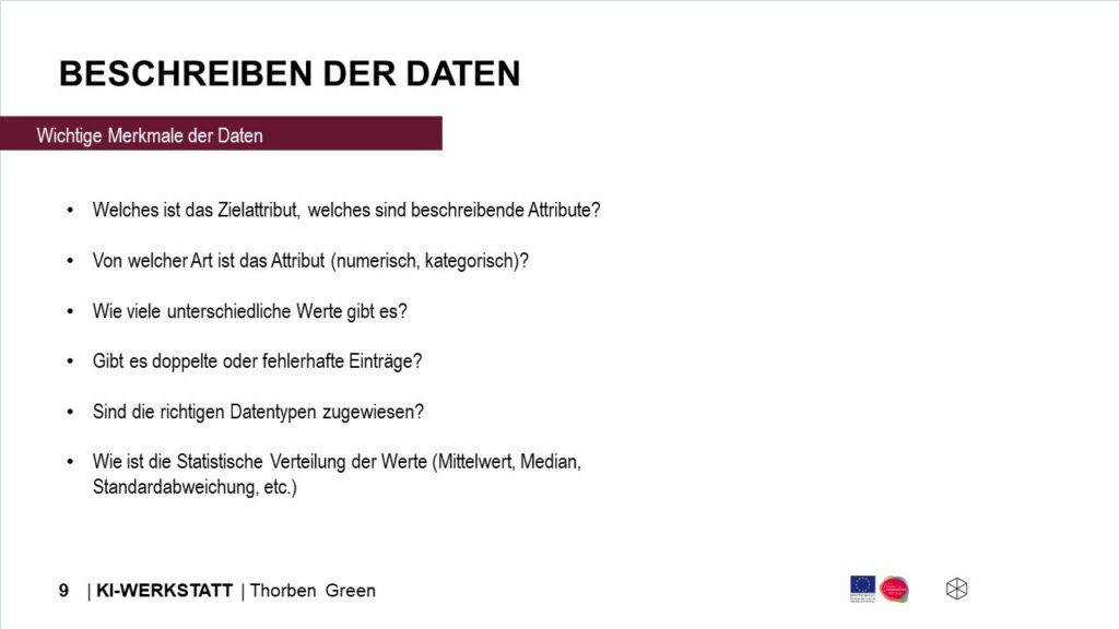 In der ML-Anwendung wird eine Unterscheidung in Zielattribut und beschreibende Attribute vorgenommen. Diese lassen sich unterteilen in numerische und kategorische Attribute.